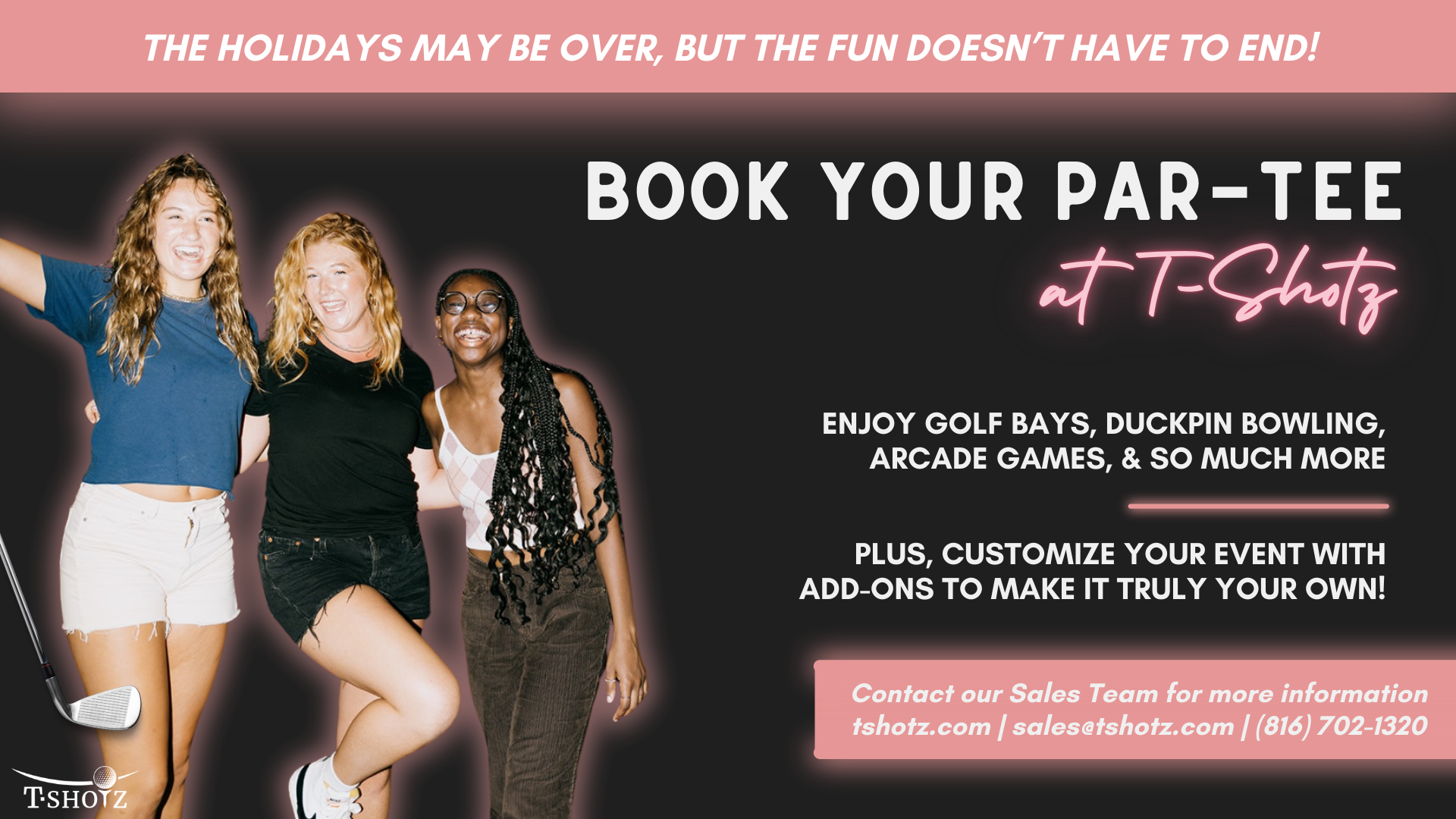 The holidays may be over, but the fun doesn't have to end! Book your par-tee at T-Shotz and enjoy golf bays, duckpin bowling, arcade games, and more, perfect for any occasion. Plus, customize your event with add-ons to make it truly your own! Contact our sales team now at sales@tshotz.com or call sms (816) 702-1320 to book yours!